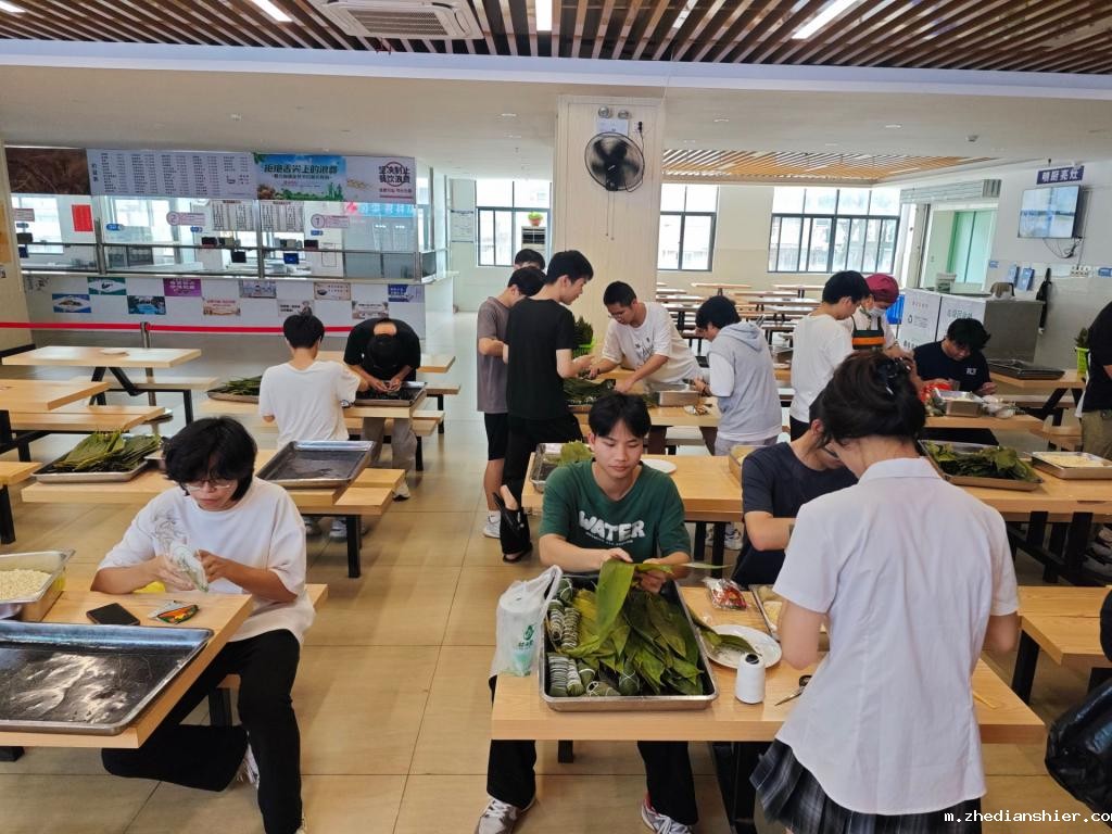 端午前夕,学校三个校区的食堂同步开展着“粽香寄家国”主题活动。清冽的苇叶香气丝丝缕缕,混杂着甜糯的米香。师生们围坐一堂,摆开了阵势,翻动苇叶,将雪白的糯米裹入其中,粽子虽形态不甚挺拔,投入锅中沸水,锅盖掀开时,白汽裹着浓香猛地腾起,学生们捧着烫手的粽子,一边吹气,一边在两手间来回倒腾。